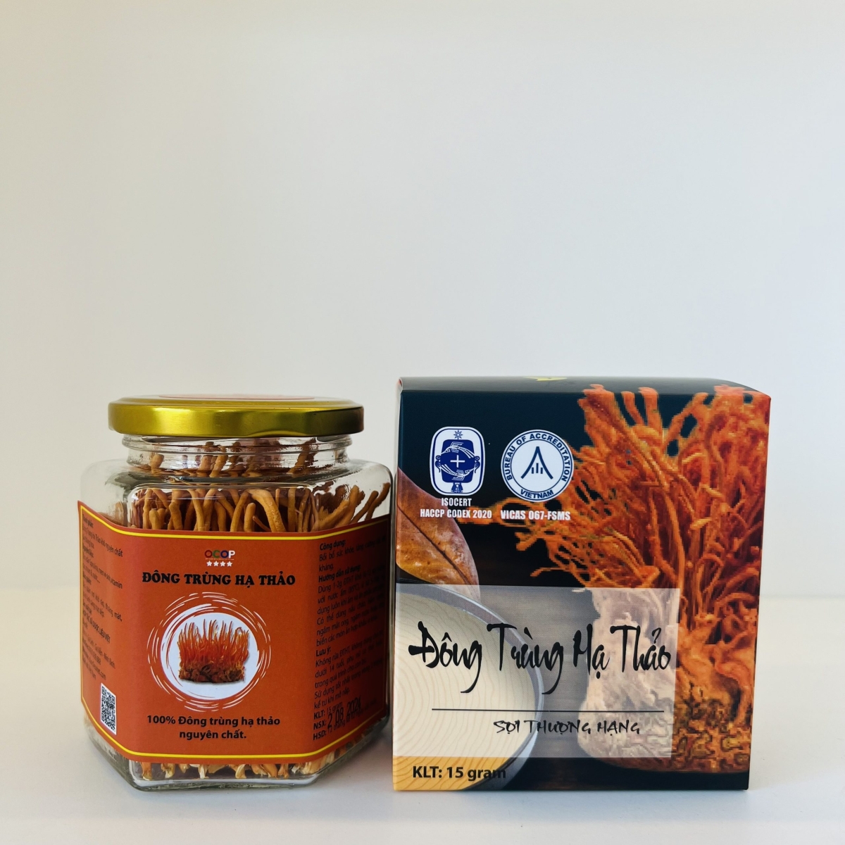Thành phần: 15gram Đông Trùng Hạ Thảo nguyên chất sấy thăng hoa Bảo quản: Bảo quản nơi khô ráo, thoáng mát, tránh ánh sắng trực tiếp Hướng dẫn: Dùng 1-2g ĐTHT khô ( 6-12 sợi nấm) với nước ấm ( 85 độ C) , ủ từ 5-10p, sử dụng luôn khi ấm và ăn phần sợi nấm. Có thể dùng nấu cháo, hầm canh, ngâm mật ong, ngâm rượu hoặc chế biến ác món ăn hợp khẩu vị khác. Lưu ý: Không rửa ĐTHT, không dùng cho trẻ dưới 14 tuổi, phụ nữ có thai hoặc trong quá trình cho con bú. Sử dụng tốt nhất trong vòng 2 tháng kể từ khi mở nắp. Hạn sử dụng: 12 tháng kể từ ngày sản xuất Sản xuất tại: Hợp tác xã dược liệu Việt